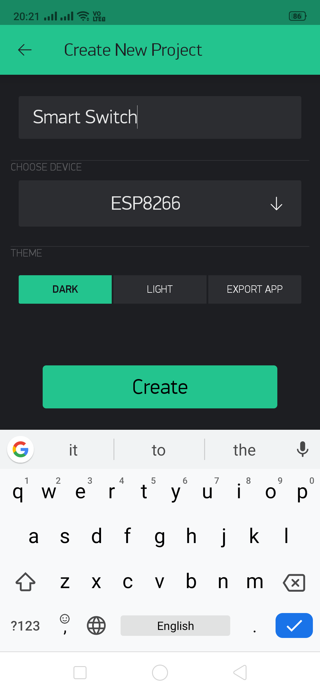 Enter a project name and select a device as ESP8266. We have given Smart Switch. Tap on create.