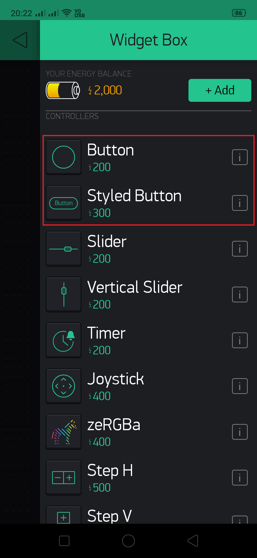 Tap on widget box to add below widgets. For every new user there will be 2000 Energy balance credited, which is enough for this project.