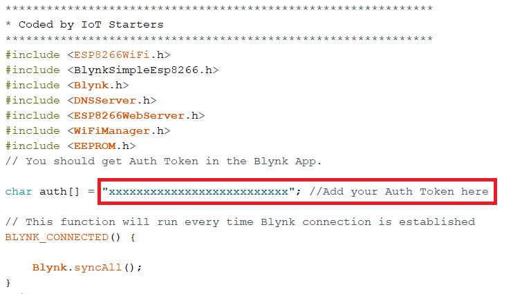 This code is quite simple. We will be using Arduino IDE for uploading the code in ESP8266 module. First copy the Auth Token that you have received while creating this project.