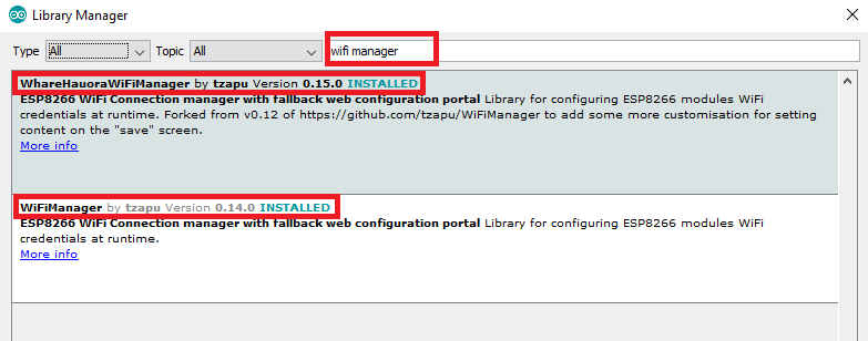 Once you open manage libraries search for wifi manager and install the highlighted ones.